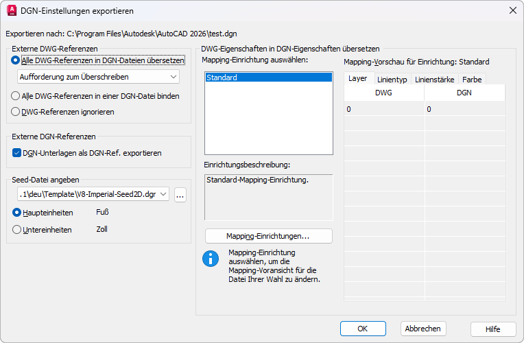 Standard ist die vorgabemäßige Mapping-Einrichtung, die Daten aus der exportierten Zeichnung extrahiert und ein automatisches Mapping für DGN-Layer, Linientypen, Linienstärken und Farben, wie in der Mapping-Voransicht angezeigt, verwendet.