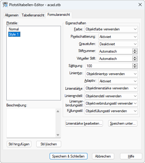 Beide Registerkarten enthalten sämtliche in der Plotstiltabelle enthaltenen Plotstile sowie die dazugehörigen Einstellungen.