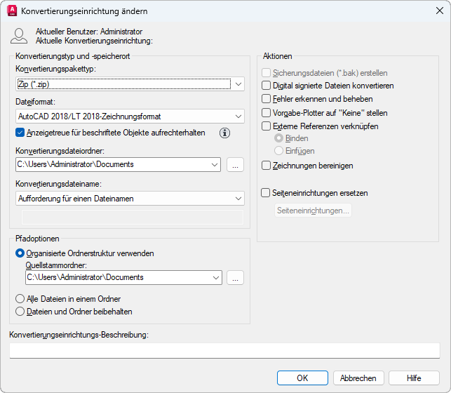 Wenn Sie dieses Feld nicht ausfüllen, wird die Konvertierungsdatei in dem Ordner erstellt, der die zuerst festgelegte Zeichnungsdatei enthält. In einem Plansatzkontext wird die Konvertierungsdatei in dem Ordner angelegt, der die Plansatzdatendatei (DST) enthält.