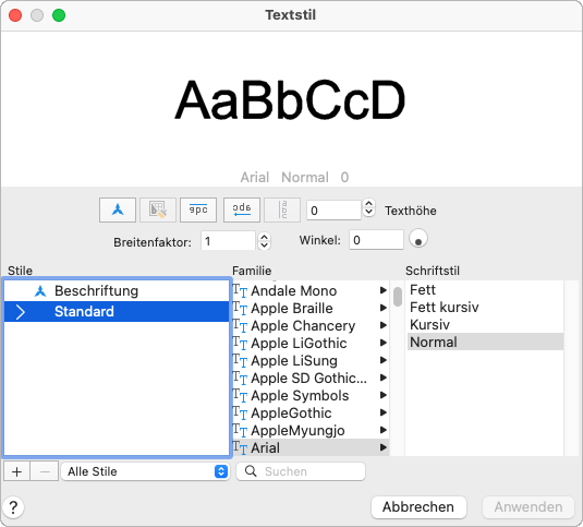Zur Bearbeitung der Eigenschaften einer Schrift, beispielsweise Höhe, Breitenfaktor, Neigungswinkel oder Anzeige (um 180 Grad gedreht, rückwärts oder senkrecht ausgerichtet).