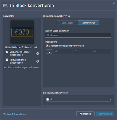 Bietet Optionen, mit denen Sie wählen können, ob ausgewählte Exemplare in einen vorhandenen Block konvertiert werden oder ein neuer Block erstellt werden soll.