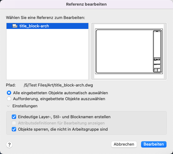 Die Voransicht entspricht der Referenz nach dem letzten Speichern in der Zeichnung. Die Voransicht der Referenz wird nicht aktualisiert, wenn Sie Änderungen an der Referenz zurückspeichern.