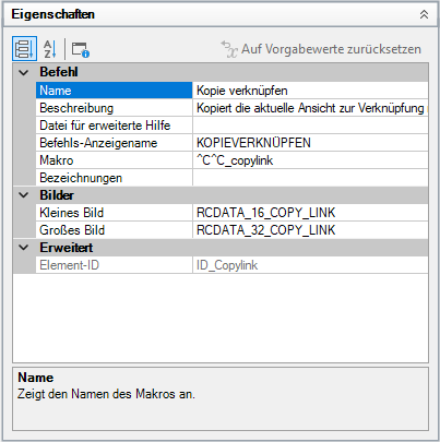 Die Tilde (~) und das Ausrufezeichen, gefolgt von einem Punkt (!.), werden vor die Befehlsbeschriftung Kopie verknüpfen (Eigenschaft Name des Bereichs Eigenschaften) gesetzt. Es folgt eine Darstellung des Befehls Kopie verknüpfen, der im Menü Bearbeiten markiert und grau abgeblendet ist.