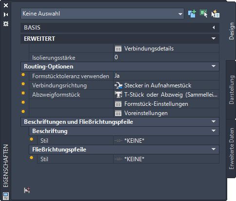 Eigenschaften auf der Registerkarte Design der Eigenschaftenpalette, die zum Hinzufügen von Rohrobjekten verwendet werden