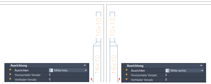 Das folgende Beispiel veranschaulicht den Unterschied zwischen den Ausrichtungen Oben links und Oben rechts bei einem Luftkanal/-rohr-Objekt. Beachten Sie, dass die durch die Pfeile angegebene Zeichnungsrichtung die Darstellung der Ausrichtung in der Zeichnung bestimmt.