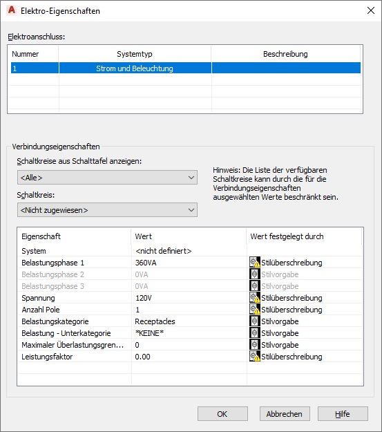 klicken .Das Arbeitsblatt Elektro-Eigenschaften führt die Verbinder am Gerät auf und zeigt für jeden Verbinder den Systemtyp sowie die Beschreibung an. Diese Geräteattribute werden durch den Gerätestil bestimmt. Um ihn zu ändern, ist es erforderlich, die Verbinder im Stil zu ändern.