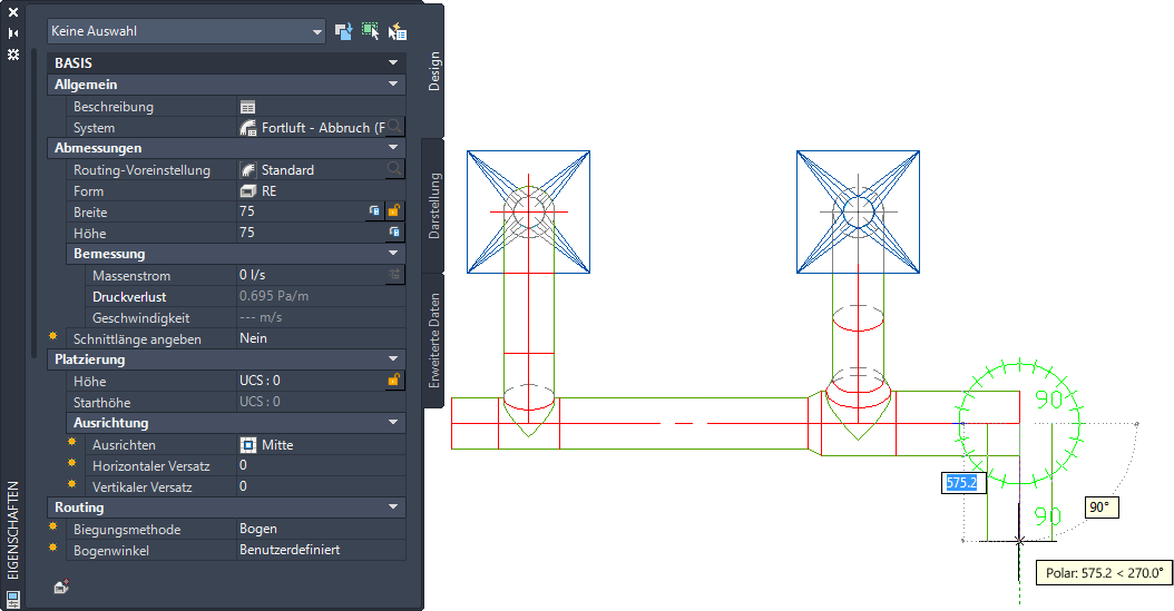 Wenn Sie der Auslassausstattung Volumenstromwerte zugewiesen haben, können Sie mit dem Sofortberechnungswerkzeug beim Zeichnen von Luftkanal/-rohr-Strecken die Größen des Luftkanal/-rohr-Systems berechnen. Das Sofortberechnungswerkzeug kann auch zum Ändern von vorhandenen Luftkanal/-rohr-Strecken verwendet werden.