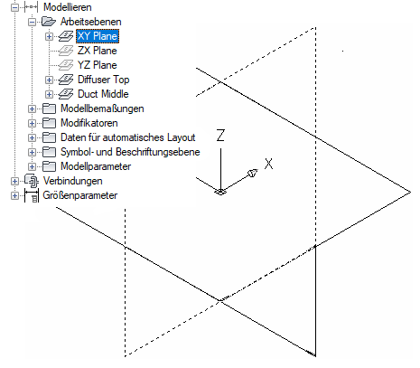 Gehen Sie wie folgt vor, um zur Erstellung von Geometrie, Pfaden und Abhängigkeiten eines Modells Arbeitsebenen hinzuzufügen. Es ist übersichtlicher, mit nur einer sichtbaren Arbeitsebene zu arbeiten, außer Sie verwenden versetzte oder Referenz-Arbeitsebenen. Die folgenden Anweisungen beziehen sich auf den Bauteil-Browser. Der Bauteil-Browser befindet sich unter der Multifunktionsleiste links vom Zeichnungsbereich.