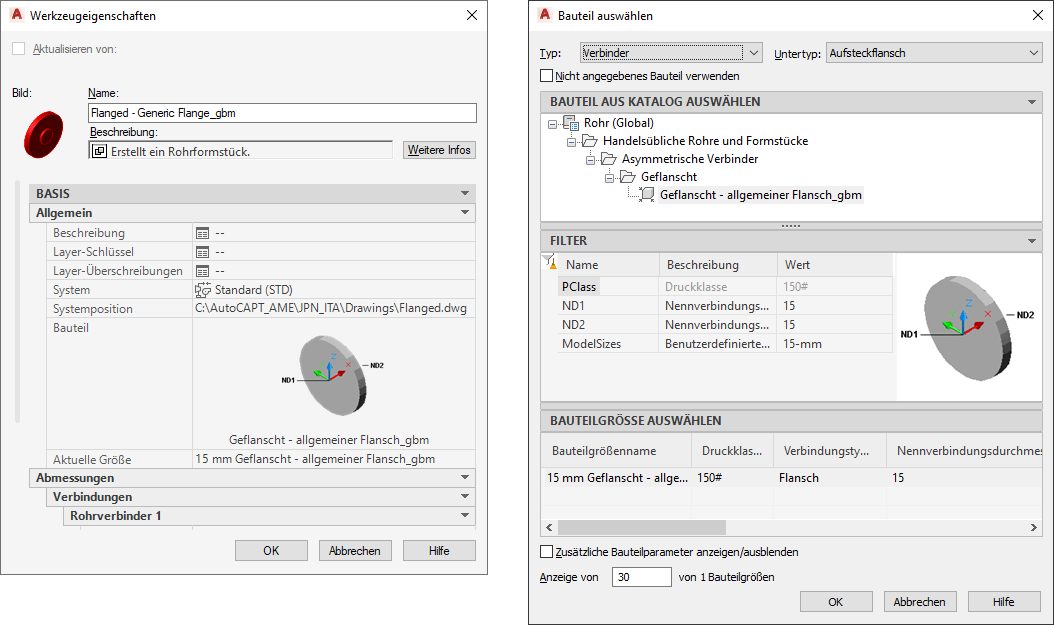 Tipp: Wählen Sie die Option zum Verwenden des unspezifizierten Bauteiltyps, um die Bauteilauswahl in diesem Dialogfeld zu deaktivieren. Mit dieser Auswahl wird in der Werkzeugpalette ein Werkzeug ohne spezifische Eigenschaften erstellt. Sie können das neue Werkzeug während des Layouts der Rohrstrecke zum Aufrufen des Befehls Rohrformstück hinzufügen für das Objekt verwenden.