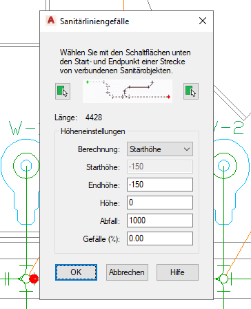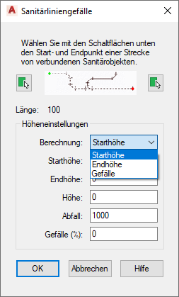 Klicken Sie im Dialogfeld Sanitärliniengefälle auf Startpunkt der Strecke wählen oder auf Endpunkt der Strecke wählen.