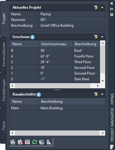 Im Projekt-Navigator werden projektspezifische Aufgaben zentralisiert, beispielsweise Definieren von Gebäudeebenen und Gebäudeabschnitten (Flügeln), Erstellen von Projektzeichnungen und Erstellen von Plotplänen.