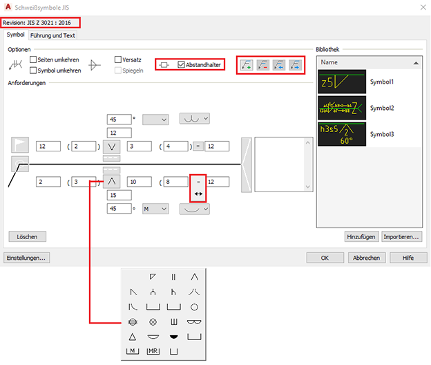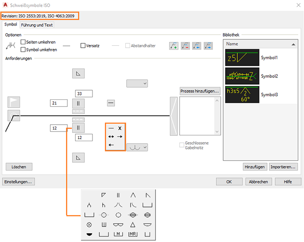 Im Dialogfeld Schweißen werden die neuesten ISO- und JIS-Revisionen angezeigt. Die entsprechenden Schweiß- und Nahtausführungssymbole werden auch im Symbolfilter aufgeführt.