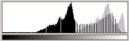 - Verschieben Sie den Kontrollpunkt in die Nähe der Koordinaten 225,150, wobei Sie das Histogramm nach links strecken und die Spitzenwerte voneinander trennen. Im linken Segment der Kurve wird hauptsächlich die Helligkeit verringert und der Kontrast der Farbtöne für Dächer und unbebaute Fläche wird erhöht. Im rechten Segment wird der Kontrast für die helleren Töne reduziert. Im Histogramm wird dies in einer Verschiebung der linken Spitze (Töne für Dächer und unbebaute Flächen) nach links deutlich, mit der die Helligkeit verringert wird, sowie in einer gewissen Komprimierung der Spitze, die eine Verringerung des Kontrasts zur Folge hat. Bei der rechten Spitze (die die Töne von Gebäudefassade und Gehsteig umfasst) ist ein Streckungseffekt zu beobachten, durch den der Kontrast verstärkt wird, sowie eine Verschiebung nach links, die zu einer geringeren Helligkeit führt.