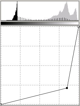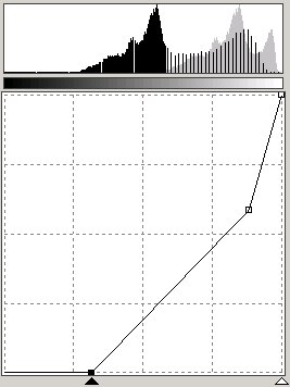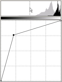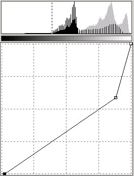 - Um den ursprünglichen Kontrast der Farbtöne für Dächer und unbebaute Flächen wiederherzustellen, verstellen Sie den linken (schwarzen) dreieckigen Schieber unten im Dialogfeld Kontrast so, dass der Abschnitt wieder einen Neigungswinkel von 45 Grad aufweist. Schieben Sie den linken Schieber, bis der schwarze Grenzwert bei ungefähr 84 liegt. Die Tatsache, dass die Kurve für Eingabewerte zwischen 0 und 80 bei einem Ausgabewert von 0 horizontal ist, ist bedeutungslos, da der ursprüngliche untere rechte Teil des Projekts innerhalb dieses Bereichs nur wenige oder gar keine Pixel aufweist.