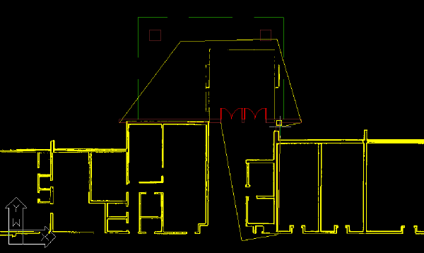 Die Vektorlinien in diesem Ausschnitt stellen die geplanten zusätzlichen Klassenräume dar. Die Rasterlinien stellen die Wände der alten Klassenräume und die alten Außenwände dar.