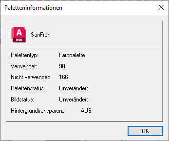 Informationen. Im Dialogfeld Paletteninformationen wird angezeigt, dass nur 90 der verfügbaren 256 Farben verwendet werden und dass für das Bild keine Hintergrundtransparenz aktiviert ist. Klicken Sie auf OK.