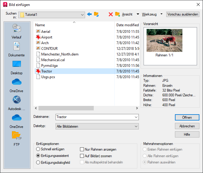 Beim Einfügen eines Bilds mit dem AutoCAD Raster Design-Toolset-Befehl Einfügen können Sie eine Voransicht des Bilds sowie Informationen wie Dateityp, Farbtiefe und Dichte anzeigen. Bei der links im Dialogfeld Bild einfügen angezeigten Ordnerspalte handelt es sich um die Liste der Speicherorte. Sie enthält Verknüpfungen zu lokalen Ordnern, z. B. dem Desktop- oder dem Dokument-Ordner.