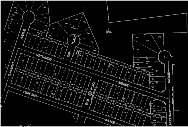 - Klicken Sie auf die Nordecke des Rechtecks, wo Elmhurst auf Northside trifft, und zeihen Sie den Mauszeiger ein kurzes Stück entlang der Ostseite der Elmhurst Ave nach Südwesten.
