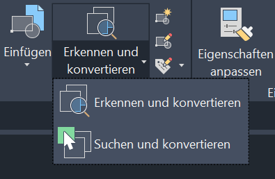 BSUCHEN: Ersetzt BKONVERT. Zeigt das Dialogfeld Konvertieren an, das Optionen zum Konvertieren von ausgewählten Objekten und identischen Elementen in Blöcke enthält.