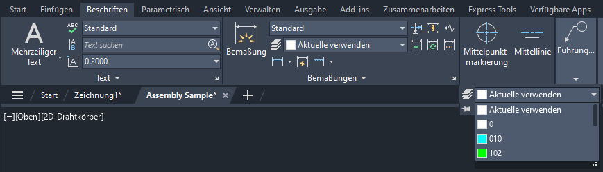 - Gehen Sie auf der Multifunktionsleiste zur Registerkarte Beschriften > Gruppe Mittellinien, und nutzen Sie das Steuerelement Layer.
