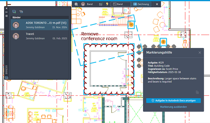 Autodesk Docs-Benutzer können nun die URL einer Layout- oder Modell-Registerkarte für Teamkollegen freigeben, die einem Band in AutoCAD Web mithilfe von Autodesk Docs-Markierungswerkzeugen Markierungen hinzufügen können. Diese Verbesserung ermöglicht es mehreren Teamkollegen, Zeichnungen problemlos gemeinsam zu nutzen und Markierungen und Revisionen hinzuzufügen.