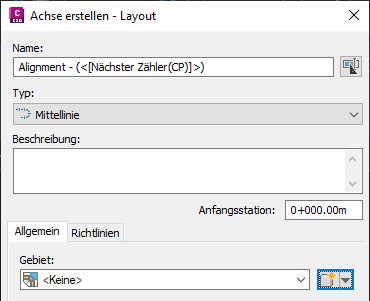 Wenn Sie in den Dialogfeldern Achse erstellen oder Achse erstellen - Aus Polylinie eine Achse erstellen, wird standardmäßig eine Achse ohne festgelegtes Gebiet (<Keine>) erstellt (siehe Abbildung 2).