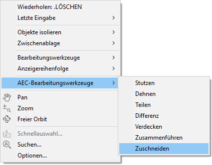 Bevor Sie Höhenlinienpolyliniendaten zu einem DGM hinzufügen, überlegen Sie, ob die Daten Gelände enthalten, die für die Konstruktionszwecke nicht erforderlich sind. In diesem Fall können Sie unerwünschte Bereiche der Höhenlinien mit den AEC-Bearbeitungswerkzeugen beschneiden. Wie in Abbildung 5 dargestellt, sind diese Werkzeuge im Kontextmenü verfügbar, wenn keine Objekte in der Zeichnung ausgewählt sind.