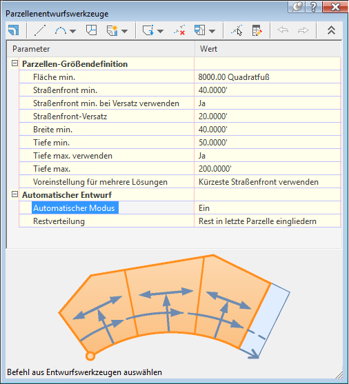 Mit den Werkzeugen für Parzellenlayout können Sie vorhandene Parzellen automatisch oder halbautomatisch teilen. Im automatischen Modus können Sie die Werkzeuge für Parzellenlayout für das automatische Entwerfen verwenden und mehrere neue Parzellen, die den verfügbaren Bereich einnehmen werden, in der Voransicht anzeigen. Wenn Sie den automatischen Modus deaktivieren, entwerfen die Layoutwerkzeuge vorgeschlagene neue Parzellen nacheinander.