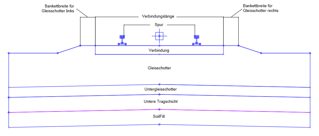 In der Entwurfsdarstellung stellt der Querschnittsbestandteil die Verknüpfungen dar, die aus Schienen, Verbindung, Gleisschotter, Untergleisschotter und Seitenneigungen bestehen.