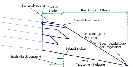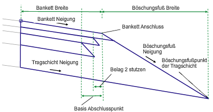 Die Deckschicht des Banketts wird für die vorgegebene Bankettbreite und mit der Vorgabebankettneigung vom Zuordnungspunkt aus nach außen eingefügt. Die Tragschichtverknüpfung wird vom Zuordnungspunkt zu UntereTragschicht Tiefe unterhalb der Deckschicht eingefügt.