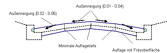 Wenn die Auflageverknüpfungen zu flach sind, wird die Tiefe der Auflage erhöht, um die Mindestneigungen zu erreichen. Wenn hierdurch zu viel Querneigungsdifferenz entsteht, müssen eventuell weitere Anpassungen und Fräsungen durchgeführt werden. Im folgenden Diagramm wird die Auflage mit der Fräsvariante veranschaulicht.