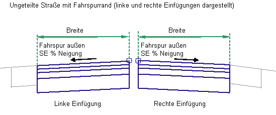 Dieser Querschnittsbestandteil fügt eine Fahrspur ein, wobei der Wert für die Überhöhungsneigung der Außenfahrspur angewendet wird, und verbreitert den Fahrbahnbelag an den überhöhten Bereichen.