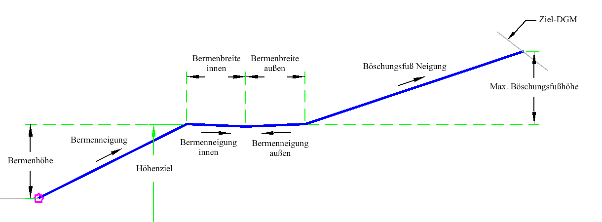 Der erste Anschlusspunkt wird am Zuordnungspunkt angesetzt. Die Anschlusspunkthöhe wird mit dem Ziel-DGM abgeglichen, um zu bestimmen, ob das Querprofil in der Abtrags- (Einschnitt) oder Auftragssituation (Damm) liegt. Daraufhin wird die erste Verknüpfung bis zur Zielhöhe erstellt. Anderenfalls wird sie auf Bermenhöhe festgelegt. Die Bermenverknüpfungen werden hinzugefügt. Der Anschlusspunkt wird auf den Außenrand der Berme zurückgesetzt, woraufhin eine Böschungsfußverknüpfung gefunden wird.