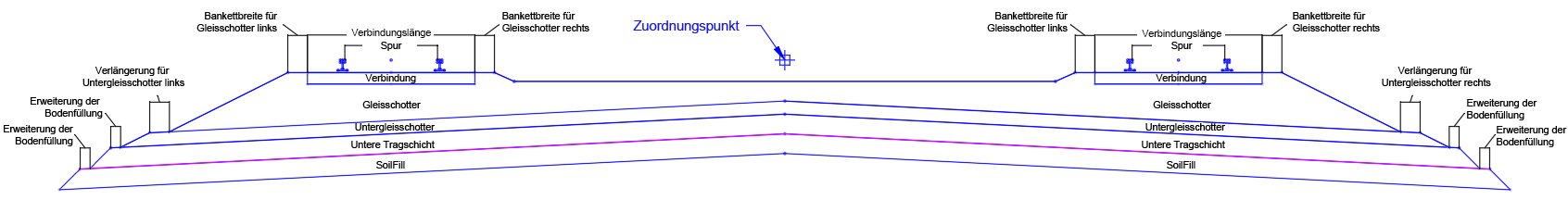 In der Entwurfsdarstellung stellt der Querschnittsbestandteil die Verknüpfungen dar, die aus Schienen, Verbindung, Gleisschotter, Untergleisschotter und Seitenneigungen bestehen.