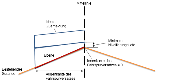Die korrigierte Querneigung wird berechnet und angewendet, es wird jedoch keine Höhenanpassung oder Flattern angewendet. In einigen Fällen wird evtl. die minimale Nivellierungstiefe nicht erreicht.