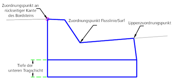 Der Zuordnungspunkt befindet sich am Auskragungspunkt des Rinnsteins, an der Rückseite des Bordsteins oder an der Fläche des Bordsteins.