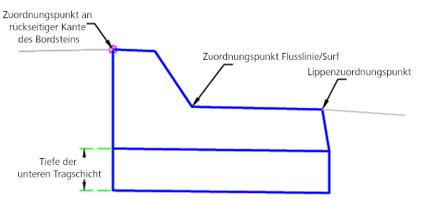 Die Bord- und Rinnsteinverknüpfungen werden basierend auf den im Querschnittsbestandteil gespeicherten Werten eingefügt. Alle Bemaßungen sind positiv und ungleich Null. Wird eine untere Tragschichttiefe ungleich null angegeben, wird die untere Tragschicht nicht eingefügt. Die untere Tragschicht schließt zur rückseitigen Unterkante des Bordsteins ab.