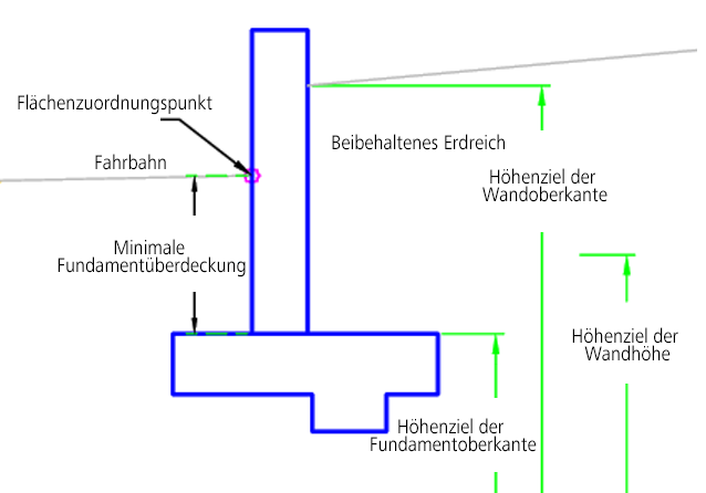 | Oberkante der Wand | Kann verwendet werden, um die Höhe der Wandoberkante zu überschreiben, wenn der Zuordnungspunkt auf der Fläche liegt. Folgende Objekttypen können beim Festlegen der Höhe als Ziele verwendet werden: Längsschnitte, 3D-Polylinien, Elementkanten oder Vermessungslinienzüge. | Optional |