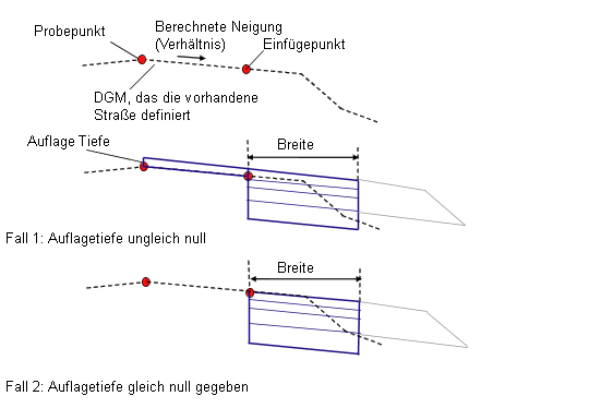 Die Höhen vom Probepunkt und Einfügepunkt auf vorhandenem DGM werden bestimmt und die Neigung vom Probepunkt zum Einfügepunkt berechnet. Oberhalb der vorhandenen Fahrspur wird eine Auflageschicht mit derselben Neigung für die angegebene Auflage Tiefe hinzugefügt. Durch Überlagerung einer oder mehrerer Verknüpfungen über der vorhandenen Neigung wird eine abgeschlossene Auflage-Profilart erstellt. Die Aufweitungsfahrspur wird unter Verwendung der berechneten Neigung am Einfüge Versatz nach außen zugeordnet.