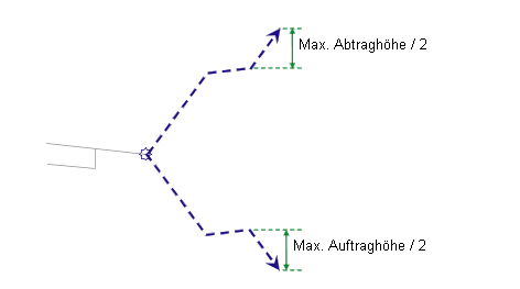 Der erste Anschlusspunkt wird am Zuordnungspunkt angesetzt. Die Anschlusspunkthöhe wird mit dem Ziel-DGM abgeglichen, um zu bestimmen, ob das Querprofil in der Abtrags- (Einschnitt) oder Auftragssituation (Damm) liegt. Es wird unter Verwendung des angegebenen Werts für Abtrag oder Auftrag eine Schnittkante zum Ziel-DGM berechnet. Übersteigt die Höhe der Schnittkante den Wert für Max Höhe wird die Verknüpfung mit der Max Höhe eingefügt und die Bermen-Verknüpfung hinzugefügt. Der Anschlusspunkt wird auf den Außenrand der Berme zurückgesetzt und der Vorgang so lange wiederholt, bis eine Böschungsfußverknüpfung gefunden wurde, die den Wert für Max Höhe nicht überschreitet.