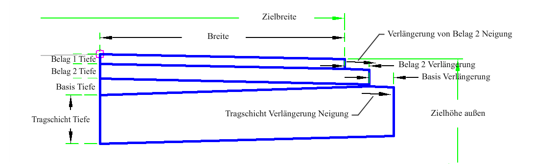 Die Deckschicht des Banketts wird für die vorgegebene Bankettbreite und mit der Vorgabebankettneigung vom Zuordnungspunkt aus nach außen eingefügt. Daraufhin werden die Zwischenschichtpunkte und die Verknüpfungen gezeichnet. Eine Zwischenschichtverlängerung wird unter Verwendung der Eingabeparameter bereitgestellt. Der Basispunkte und -verknüpfungen, einschließlich der Erweiterung, werden unter Verwendung der Eingabeparameter berechnet. Die Tragschichtpunkte, -verknüpfungen und -profilart, einschließlich der Erweiterung, werden unter Verwendung der Eingabeparameter berechnet.