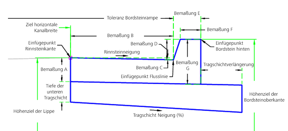 | Bemaßung E | Breite von der Flusslinie des Rinnsteins bis zur rückseitigen Kante des Bordsteins | Numerisch, positiv, ungleich Null |