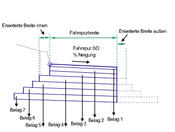 | Belag7 Angabe der Breite | Gibt an, wie die Breite des Belag7 angegeben wird | Zeichenfolge, Kombinationsliste mit folgenden Optionen: Mit höherem Fahrbahnbelag-Layer abgleichen, Breite, Versatz innen-Versatz außen, Versatz innen-Breite | Mit höherem Fahrbahnbelag abgleichen |