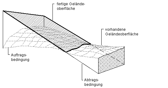 Bei der Mengen nach Prismenmethode werden die Punkte von zwei DGMs verwendet sowie eine beliebige Position, an denen sich die Dreieckskanten zwischen den beiden DGMs schneiden. Die Mengen von Abtrag und Auftrag sowie die Nettomenge werden basierend auf den Höhenunterschieden zwischen den beiden DGMs berechnet.