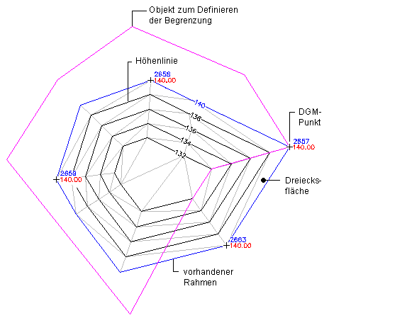 Begrenzungen sind geschlossene Polylinien, die sich auf die Sichtbarkeit der Dreiecke innerhalb oder außerhalb der Polylinien auswirken. Die Grenzen des DGM werden durch eine äußere Begrenzung definiert. Alle Dreiecke innerhalb der Begrenzung sind sichtbar, alle außerhalb der Begrenzung befindlichen Dreiecke sind unsichtbar.