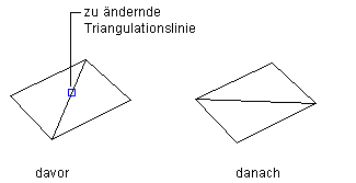 Das Umdrehen von Kanten dient dazu, die Richtung von zwei Dreiecksflächen im DGM zu ändern, um z. B. ein genaueres DGM-Modell zu erstellen. Beispielsweise können Kanten an Grate oder Bodensenken angepasst werden.