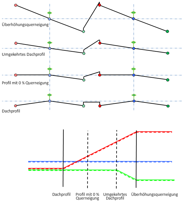 In der folgenden Abbildung wird die Drehpunktmethode Zentriert für eine baulich getrennte Straße mit Dachprofil gezeigt.