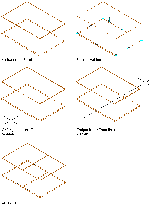Sie können eine Liniengrafik oder einen Block, der Liniengrafiken enthält, in zwei (oder mehr) Teile teilen. Hierzu zeichnen Sie eine entsprechende Teilungslinie. Sie können dann die Teile auf beiden Seiten der Linie auswählen. Wenn ein Objekt mit einer geschlossenen Umgrenzung mit dieser Option in zwei Teile geteilt wird, werden beide Teile als geschlossen neu erstellt. Wenn eine zickzackförmige offene Polylinie der Länge nach geteilt wird, werden viele auswählbare Segmente erstellt.