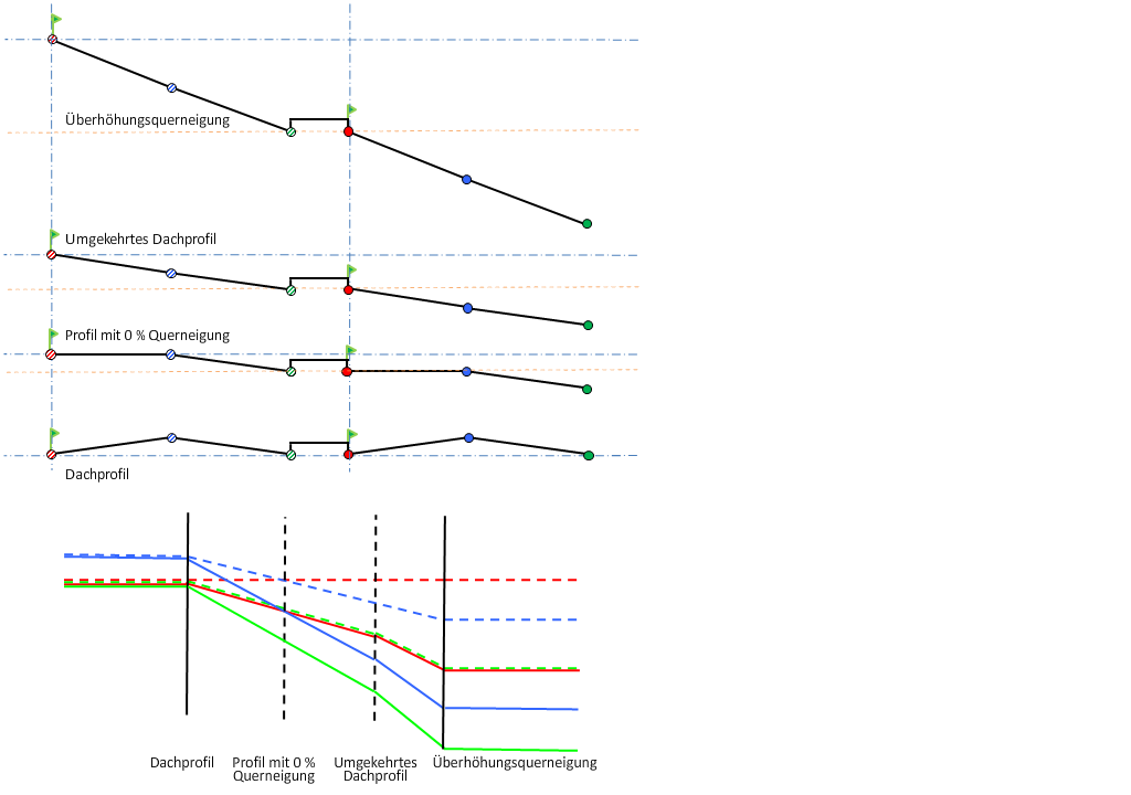Die Option Mittelstreifenkontur beibehalten bewirkt, dass beim Anwenden einer Querneigung der Mittelstreifen angehoben wird, um die Querneigung zu berücksichtigen. Mit dieser Option werden die Mittelstreifenkontur beibehalten und die Drehpunkte erhöht oder verringert.