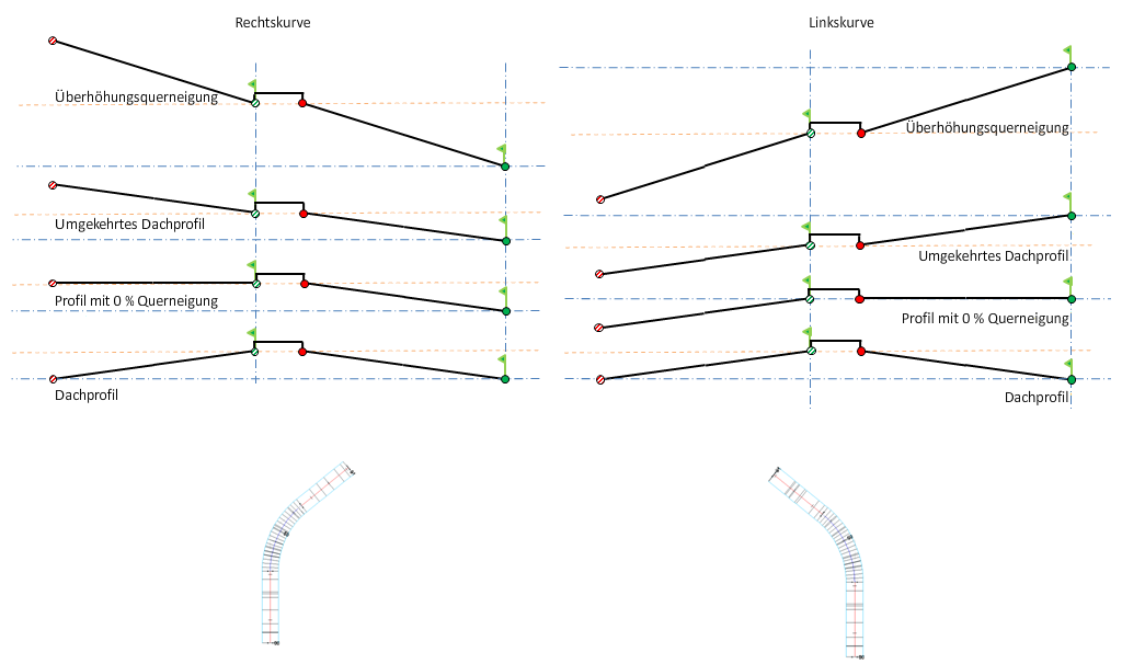 Die Option Mittelstreifenkontur beibehalten bewirkt, dass beim Anwenden einer Querneigung der Mittelstreifen angehoben wird, um die Querneigung zu berücksichtigen. Mit dieser Option werden die Mittelstreifenkontur beibehalten und die Drehpunkte erhöht oder verringert.